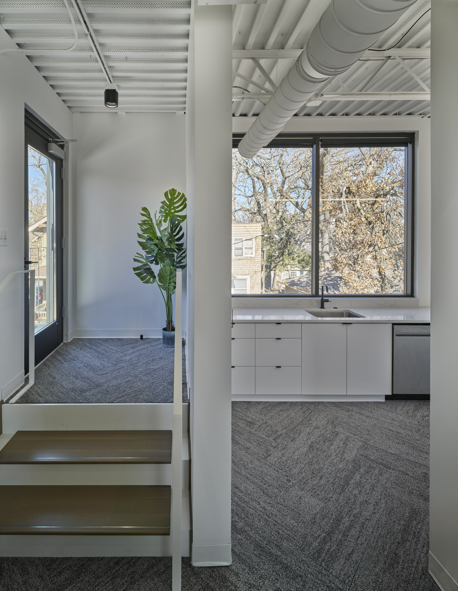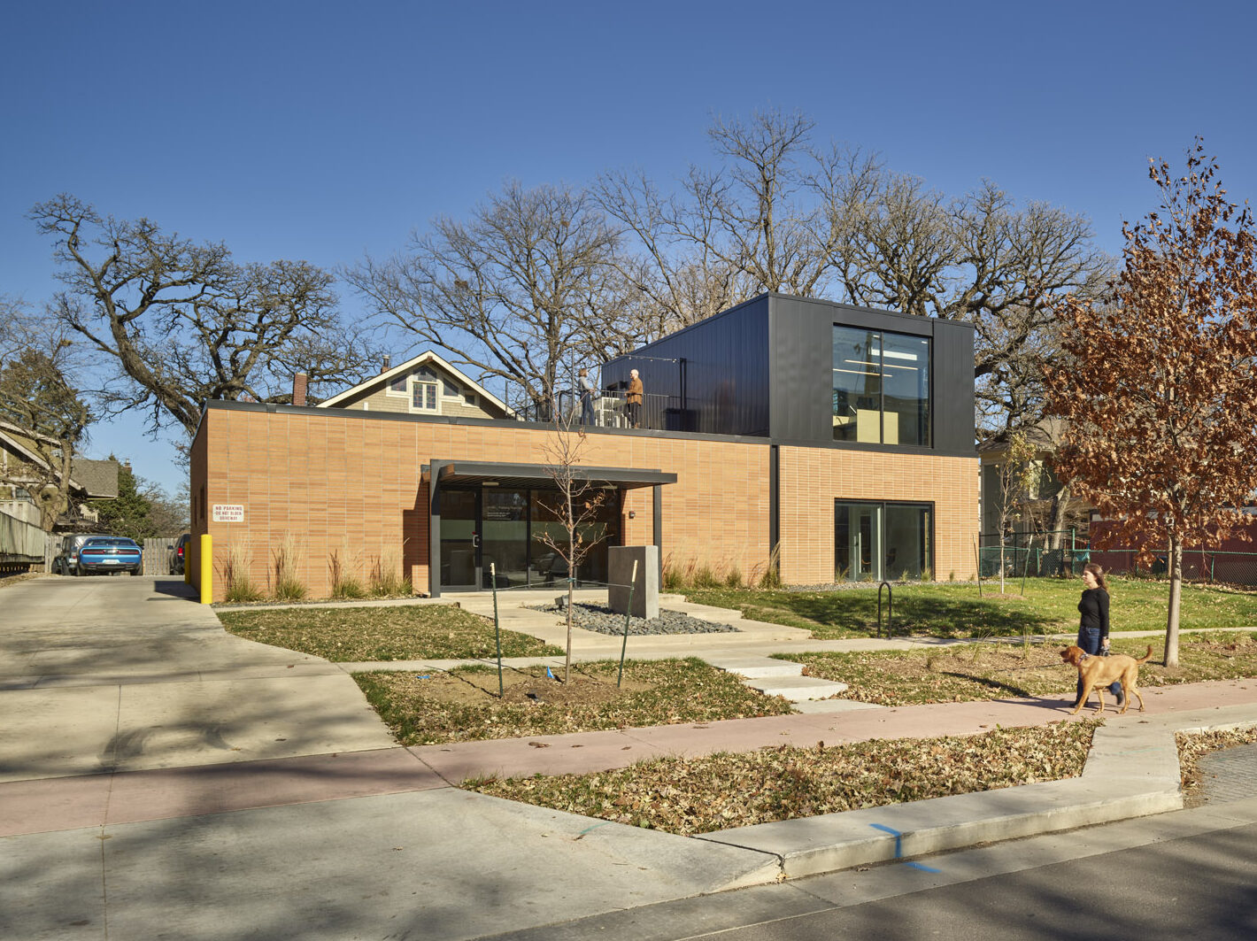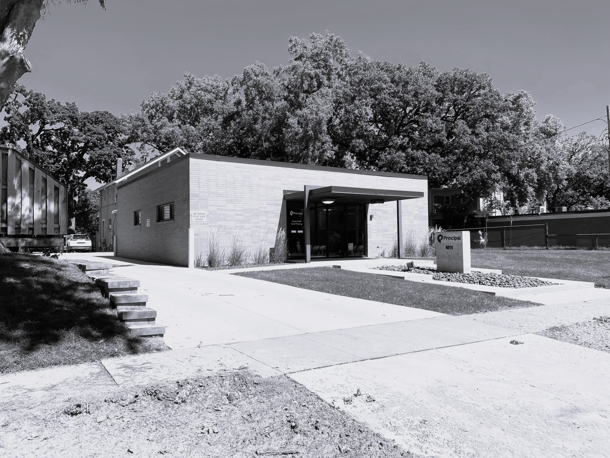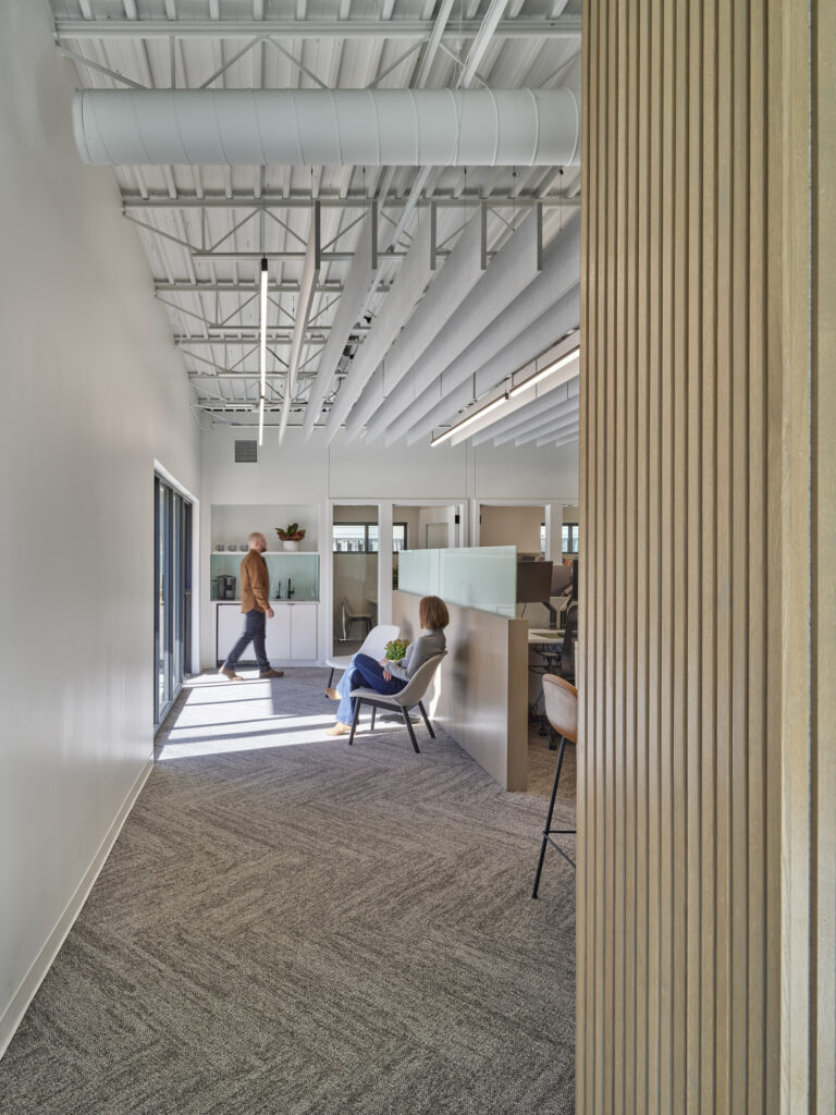 Located in a historic district of Des Moines, Iowa, this thoughtfully restored and expanded office building blends architectural preservation with contemporary workplace design. Originally a single-story masonry structure, the building underwent a full renovation and a 1,600-square-foot two-story addition to support a woman-owned financial planning firm. The original building now houses the main entrance, open work areas, and private offices, while the addition includes client meeting rooms, an upper-level suite, a breakroom, and a rooftop patio. A new staircase with a two-story art installation by local artist Sarah Grant connects the levels. The addition complements the historic structure through carefully matched materials and detailing, while a distinct metal “zipper” marks the transition between old and new. The result is a cohesive, light-filled, and functional environment that respects the building’s heritage while serving the needs of a modern business.